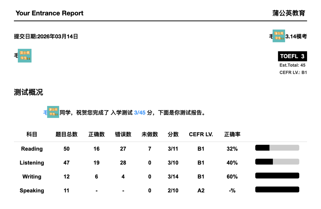 通过蒲公英精细设计的词汇测试,精准确定孩子的词汇层级(初中、高中、四级、托福/雅思、SAT)。在做计划的时候让孩子精准匹配背哪个词表,看背、听背还是听抄,避免让孩子背词断档,避免学托福背托福、学雅思背雅思等不专业计划。