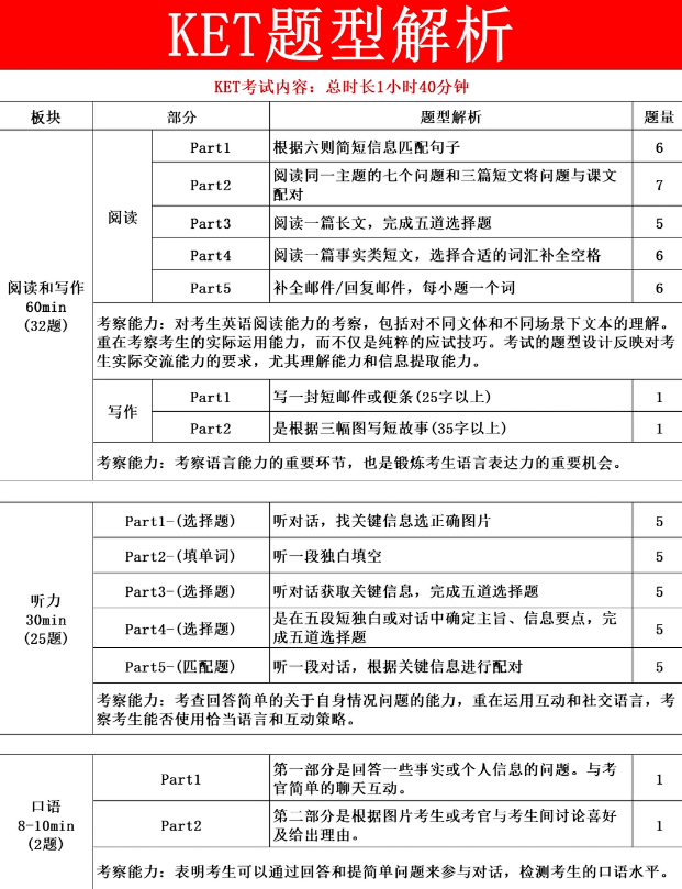 小学学霸/长期课外拓展的孩子:小学五、六年级就能通过系统备考,达到KET通过甚至优秀水平; 普通校内学生:按校内正常进度学习,初中一、二年级开始备考,初三时基本能匹配KET能力要求; 低龄启蒙孩子:幼儿园至小学低年级接触KET启蒙,主要培养语感和基础词汇,为后续考试和英语学习铺垫。