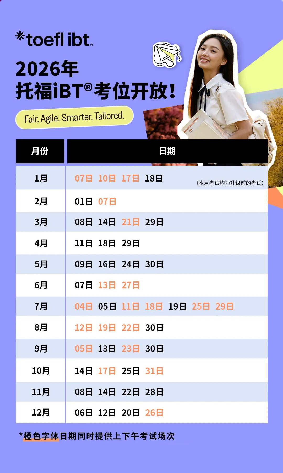 2026年托福考试时间安排,具体考试日期安排如下: