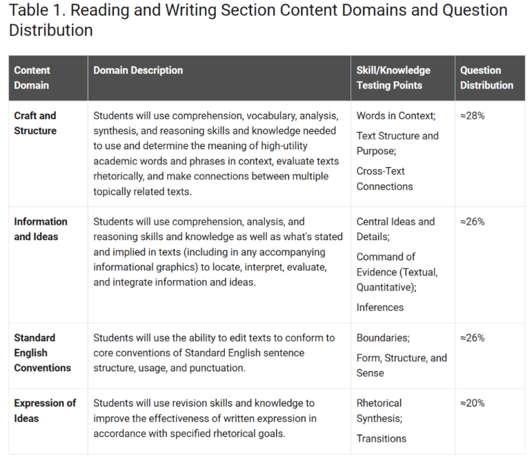 总分:800 分 题量与时长:共 54 题,限时 65 分钟,分为两个独立模块,各 27 题 考察重点:信息理解与观点分析、文章结构与修辞逻辑、语言表达清晰度、标准英语语法规范运用