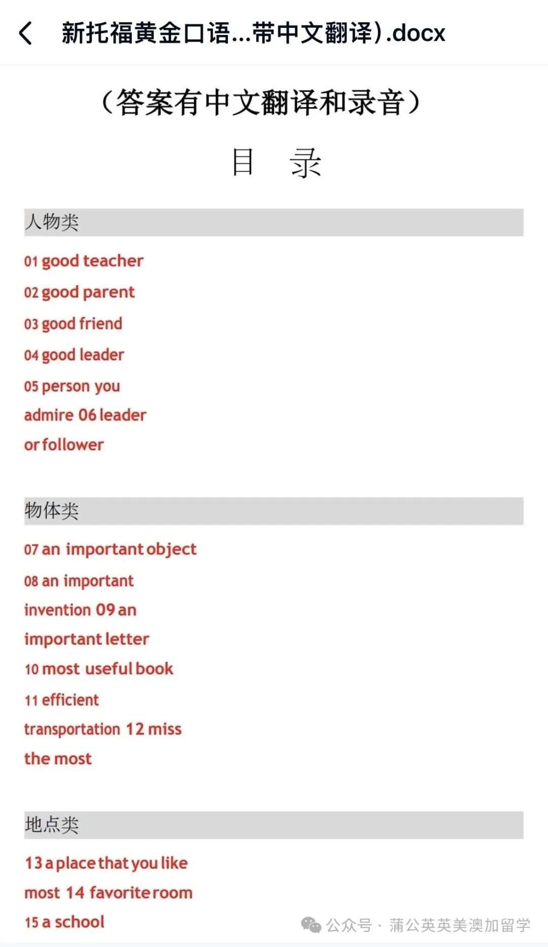 完整版资料添加蒲公英小助手回复【托福口语80题】领取!