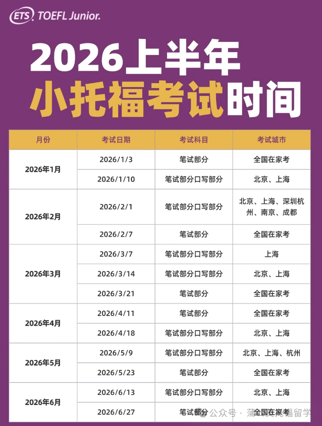 下方是2026上半年小托福完整考试时间安排,有升学辅导的家长请尽快占位,别错过黄金考试窗口!