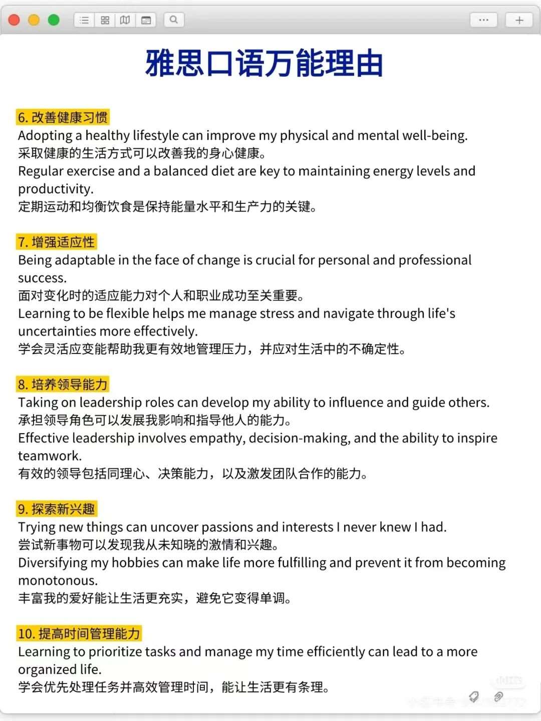 今天整理了30组雅思口语理由,全是考场高频好用款,中英文对照,背完直接用!(文末领取资料)
