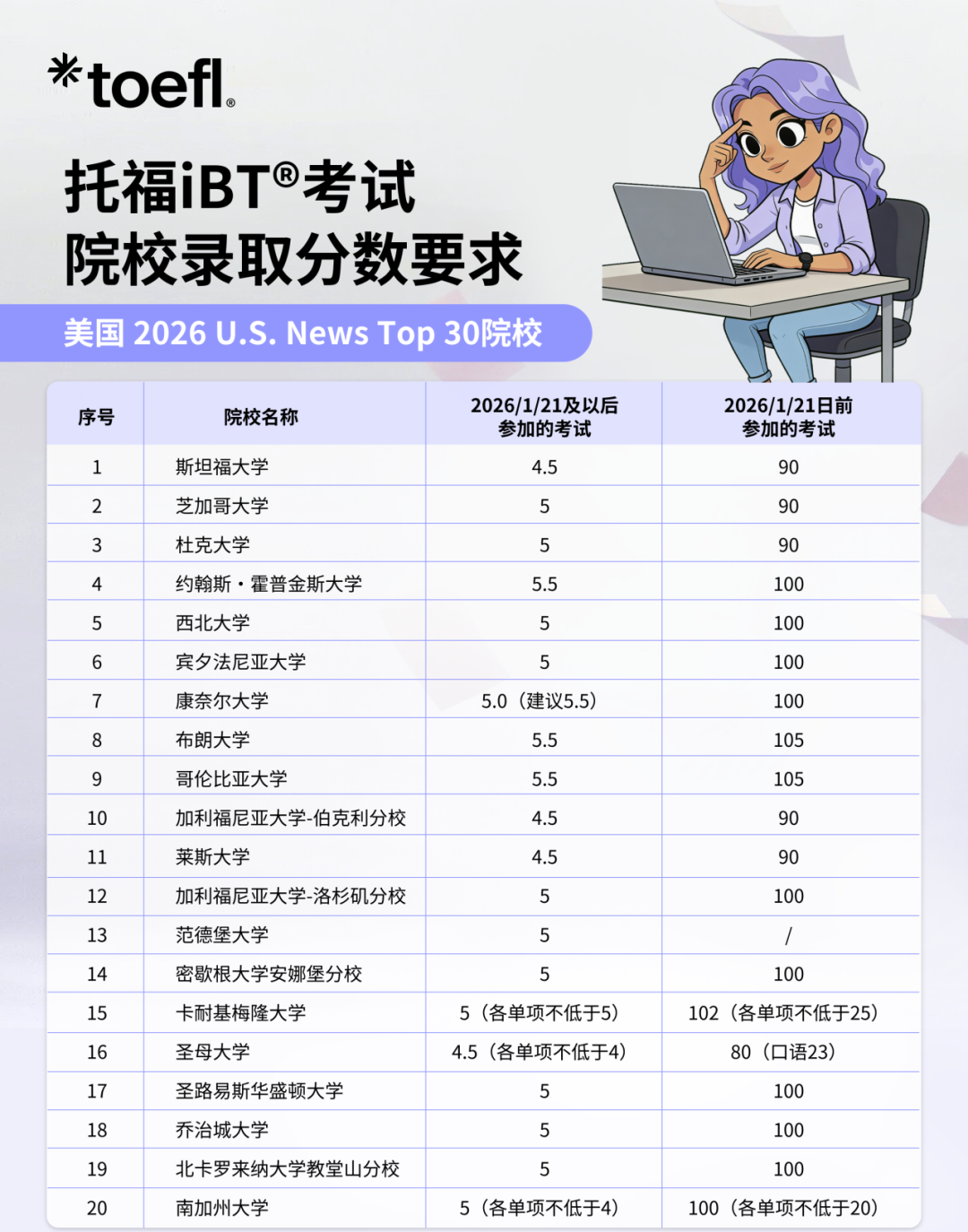 2026 年 1 月 21 日及之后考取的新托福*,总分需达到 4.5 分及以上。