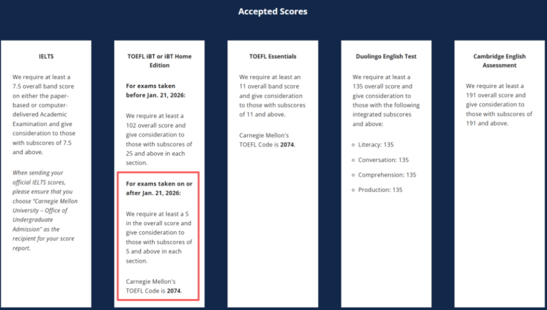 就在近期,全美 学校卡耐基梅隆大学(CMU)正式官宣了本科申请的新托福*要求,再次为留学申请圈划下重点。
