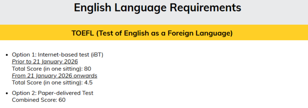 新加坡部分高校已明确新托福*要求,可作为申请语言材料提交。