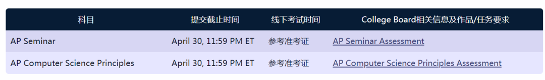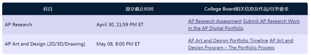 AP Art and Design艺术设计(包含2D/3D/Drawing科目)和AP Research学术论文不设线下考试。请考生关注College Board公布的提交截止日期及相关信息,按要求在线提交作品集。