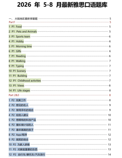 最新!2026年5-8月雅思口语题库完整版,含高分参考答案(附PDF可打印)
