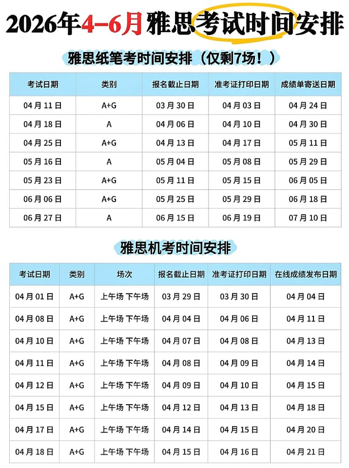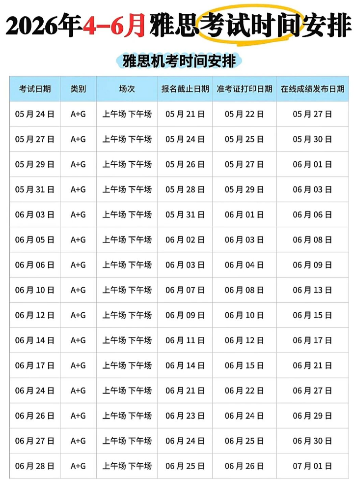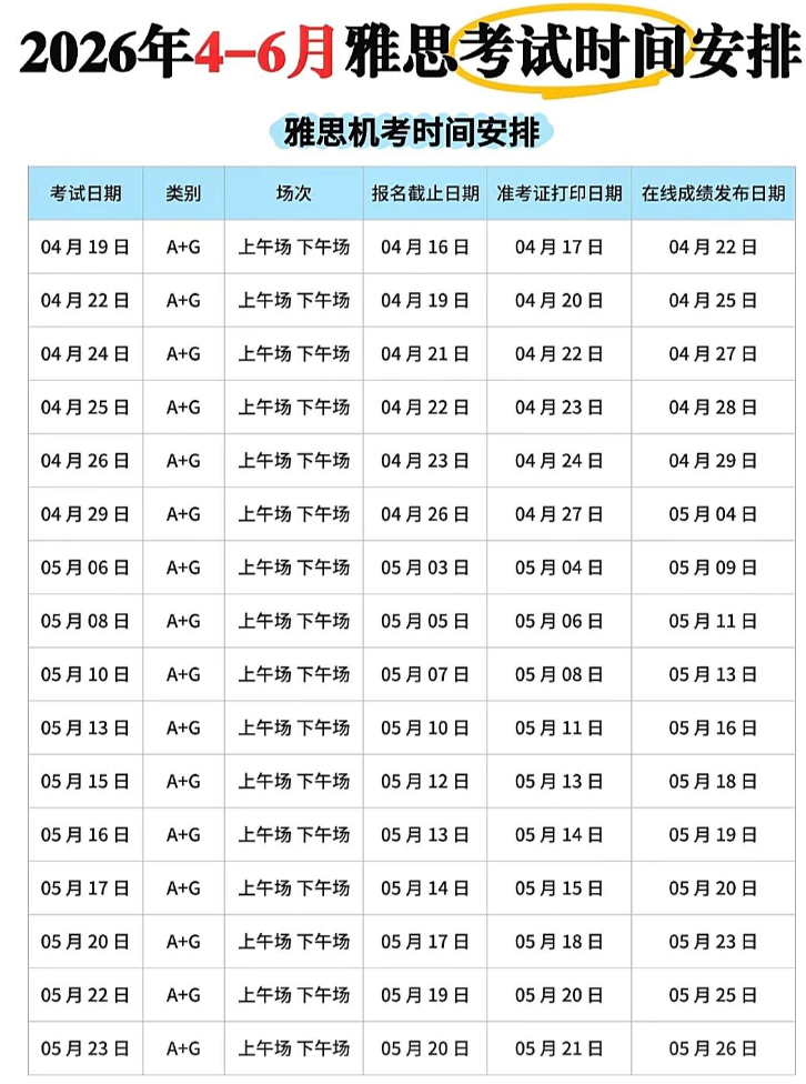 雅思考试时间2026 | 2026年4-6月雅思考试*佳时间安排表已出!附雅思精品课程培训,线上/线下多种班型,早鸟优惠!