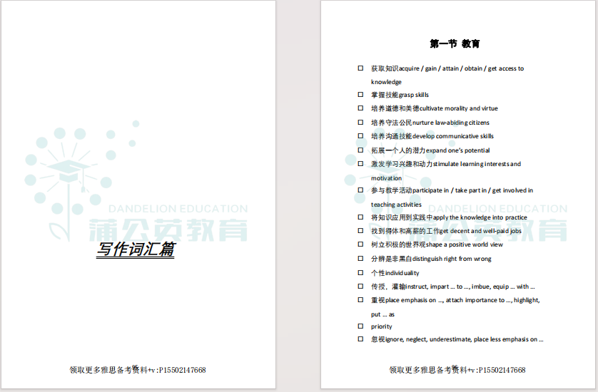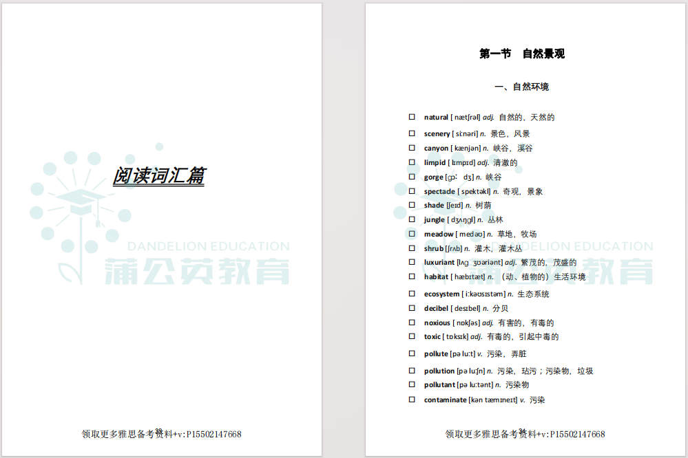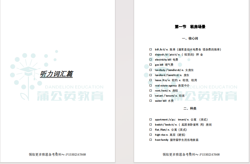 很多雅思备考的同学,一上来就抱着厚厚的词汇书死磕,从A背到Z,背了又忘,忘了又背,越背越慌,却始终看不到分数提升。其实,雅思官方从未设定一个固定的词汇量门槛,它的核心考察点,从来都不是你背了多少单词,而是你能否在不同场景下精准、灵活地运用词汇。雅思对“听、说、读、写”四项技能的词汇要求,在“量”和“质”上都截然不同:听力:侧重场景高频词,能快速反应即可,无需精准拼写;阅读:侧重同义替换和学术词汇,能快速识别词义、匹配语境即可;写作:侧重话题词伙和高分表达,需能准确拼写、灵活运用;口语:侧重话题词汇和地道搭配,需能脱口而出、自然交流。简单来说,雅思词汇备考的关键在于“精”而不在于“多”。漫无目的地背一本厚厚的词典,不如将精力集中在以下三个方向:先明确你的目标分数,再根据目标分数对应的词汇量范围,主攻高频核心词。比如目标6.5分,就先把4000左右的场景高频词啃透,再逐步拓展学术词汇,而不是一开始就死磕10000+的超纲词。严格遵循“听、说、读、写”四科对词汇的不同要求,进行差异化备考:阅读重“认”:看到能反应出词义即可,重点积累同义替换;写作重“用”:重点积累话题词伙、高分搭配,确保能准确拼写和运用;听力重“听”:重点积累租房、旅游、选课等高频场景词,能快速反应发音和词义;口语重“说”:重点积累个人、生活、社会类话题词汇,能自然表达即可。雅思的题目从来都不是脱离场景的,听力里的租房、旅游、选课;阅读里的自然、社会、学术话题;口语里的个人、生活、娱乐场景;写作里的教育、环境、科技话题,每一个场景都有专属的高频词。把词汇放在具体的场景或话题中去记忆和理解,不仅记得更快、更牢,还能直接适配考题,实现“背完就能用”。蒲公英准备了雅思场景核心4000词汇,正是为了解决大家的场景词汇痛点而生:按“听力、阅读、写作、口语”四大模块,划分了租房、旅游、选课、自然、社会、个人生活等高频场景,把雅思考试里90%以上的高频词,都按场景整理好了,帮你告别盲目背词,实现高效备考,背一个就能用一个。很多同学背单词效率低,就是因为没有场景化的资料,背的单词和考题脱节,背了也白背。而且这份雅思场景词汇pdf的词汇,都是雅思考试里反复出现的高频词,没有冗余的超纲内容,帮你节省大量备考时间,告别无效。+v:P15502147668