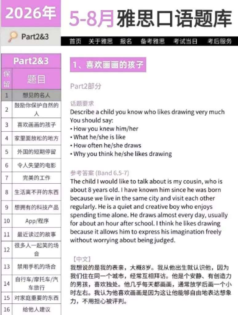 💥 !2026年5-8月雅思口语题库所有题目都配齐答案 + 音频全部内容由高分雅思口语老师执笔编写涵盖最新话题题干、7.5分口语示范答案,还有配套音频跟读!备考直接抄作业!