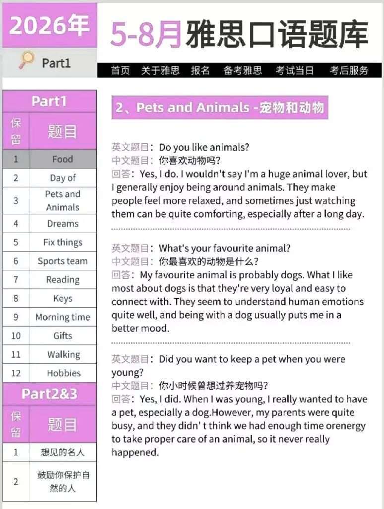 当前位置: 首页 资讯活动 【最新】2026年5-8月雅思口语题库PDF高清完整版已发布!附参考答案可打印,免费领取!