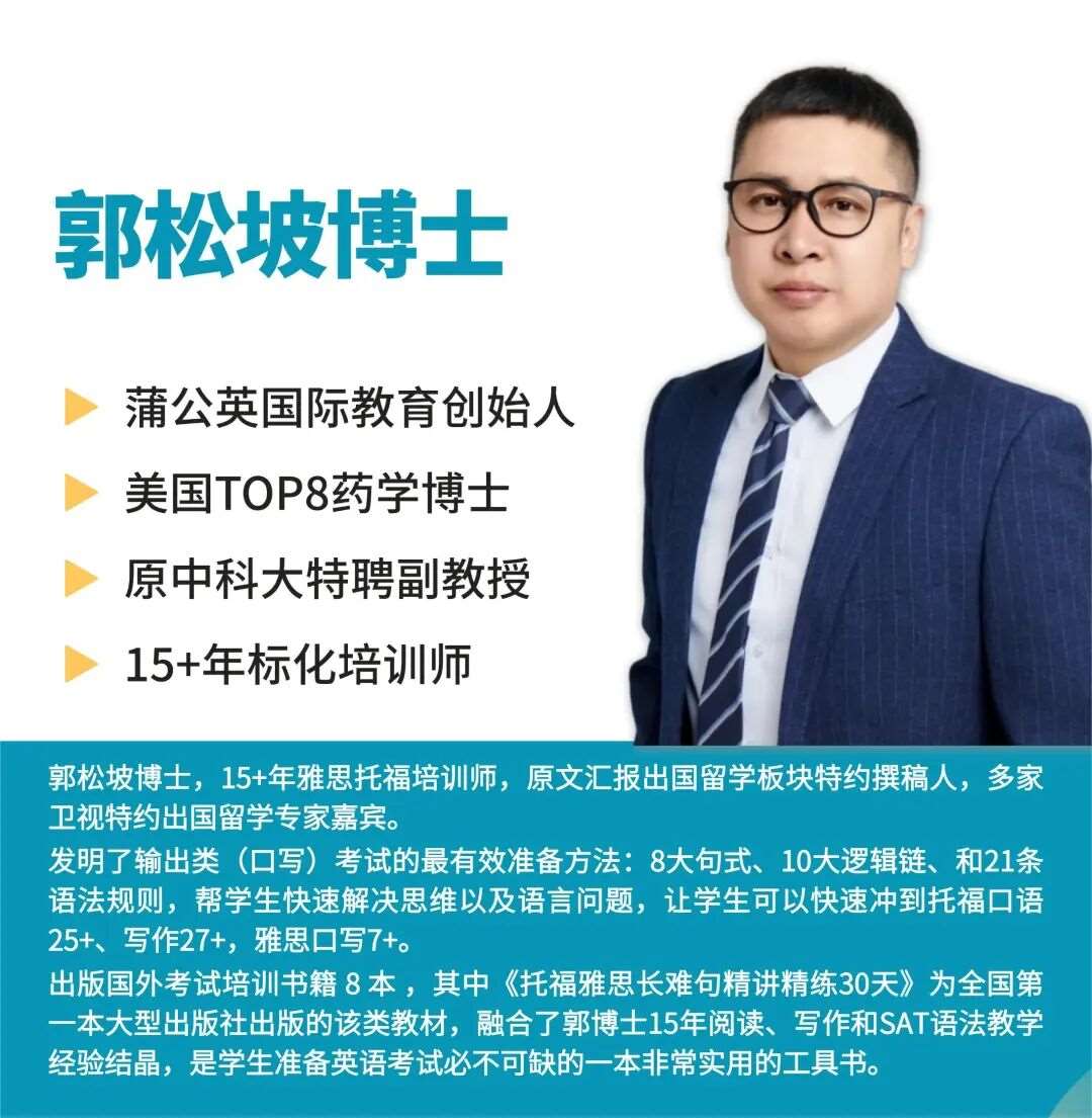 教材主编郭松坡博士拥有15+年标化考试培训经验: